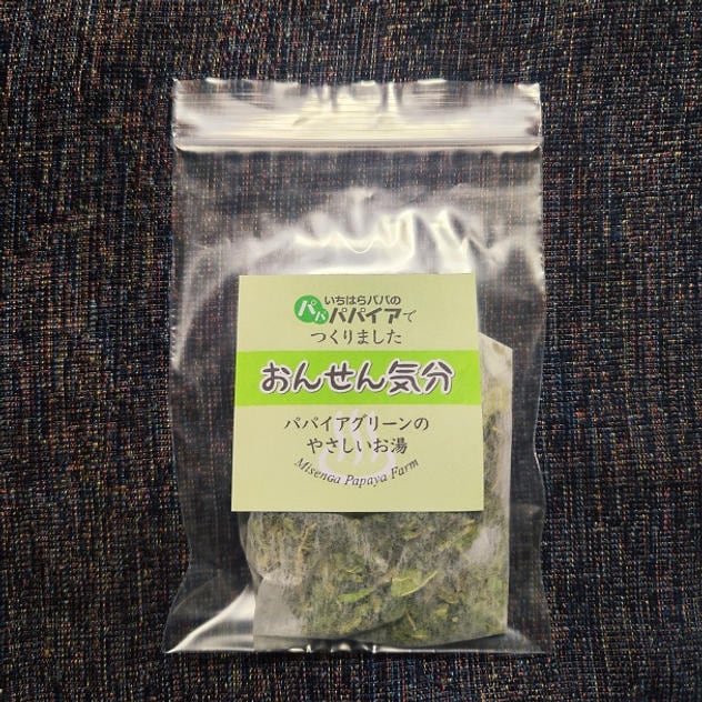 市原産無農薬栽培のパパイアの葉を乾燥し不織布袋に入れました。パパイン酵素を多く含むパパイアの葉は、入浴時にバスタブに入れるとパパイアグリーンの色が広がります。パパイアジャングルの温泉気分で、ゆっくりとリラックスをどうぞ。